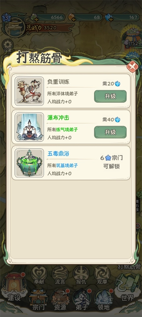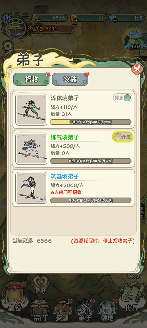 1、玩家进入游戏后,通过招募弟子来逐步扩张势力范围、占领世界版图,当自身战力达到要求时,即可发起攻占行动。