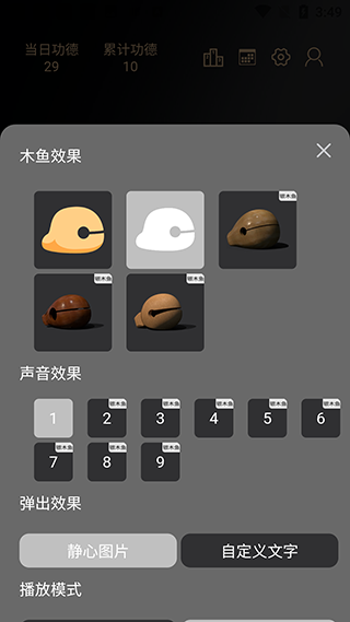 3、轻点屏幕右上角的齿轮图标,就能对木鱼的颜色、声音效果、弹出效果以及自动播放等功能进行设置。