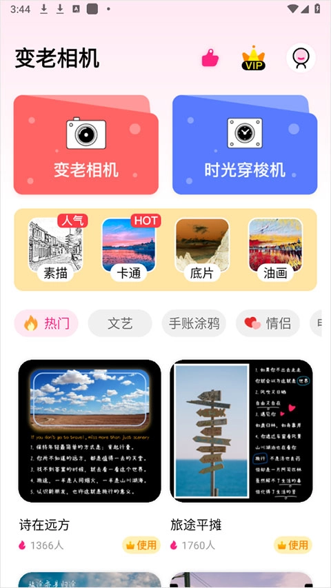1、第一步,打开变老相机,在首页你会发现能挑选各类特效。
