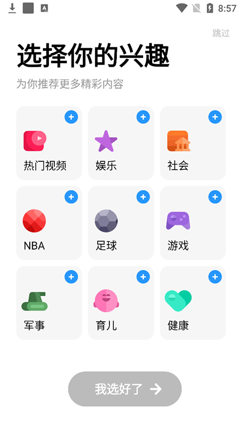 用户打开应用后,既能够依据自身喜爱的内容挑选兴趣,也能够直接点击右上角的【跳过】,不进行选择。