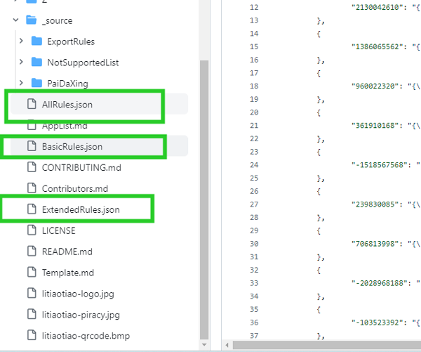 不过,小编在这里可是把最新的代码全都复制过来啦。这里主要提供了三种规则代码,其一为基础规则代码,其二是扩展规则代码,其三则是全部规则代码。单从字面意思来讲,不难理解全部规则代码涵盖了基础规则代码与扩展规则代码,这可不是小编信口胡诌,而是在GitHub代码库列表中实实在在呈现出来的。就像下图展示的那样,用户只需在代码列表里找到json文件就行,这些规则代码都是以json格式编写的。稍有编程经验的用户,一瞧见json文件,自然而然就知晓它强大的跨平台文件交换功能,在诸多编程场景中都能派上用场。不管是C++ ,还是Java,不管是前端开发者还是后端开发者,都免不了接触并使用这种格式的文件。