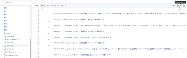 如图所示,用户仅需关注json格式文件,且在三种json文件格式里,仅需留意所有规则代码文件。接着点击右侧的“下载文件”按钮,将文件下载下来就行。