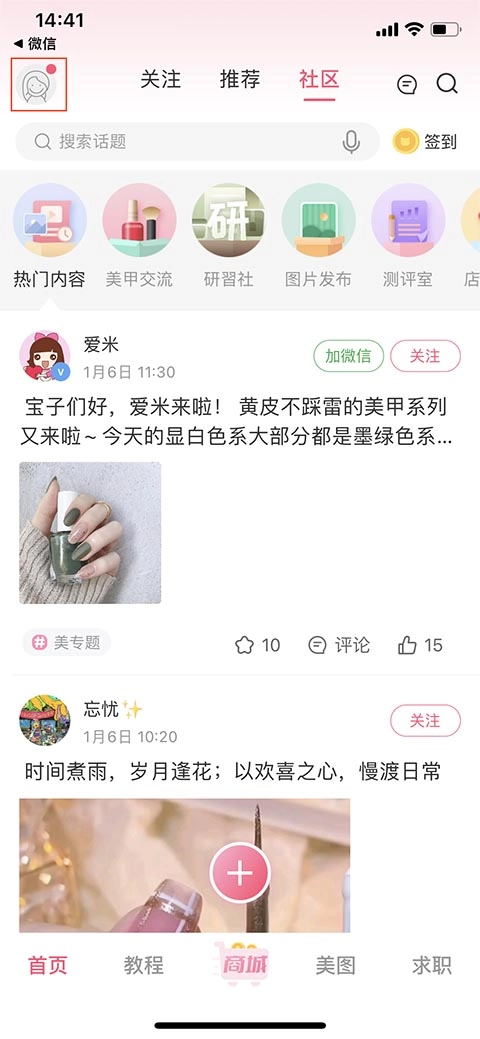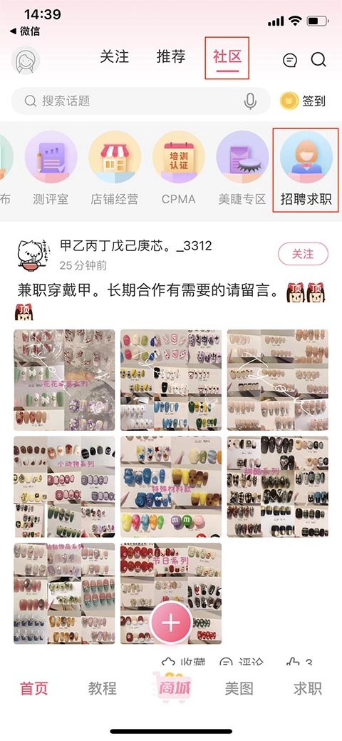 1. 打开美甲帮app,进入软件后,在顶部菜单栏能看到“关注”“推荐”“社区”这三个栏目,选中“社区”选项,接着选择“招聘求职”模块。