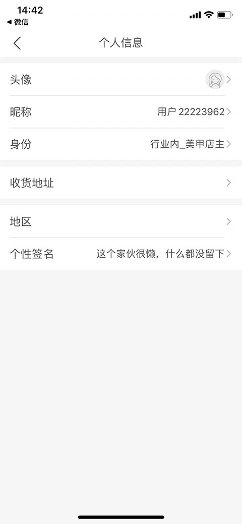 3、进入到个人信息界面,可进行“头像”、“昵称”、“身份”、“收货地址”、“地区”以及“个性签名”等信息的修改了。