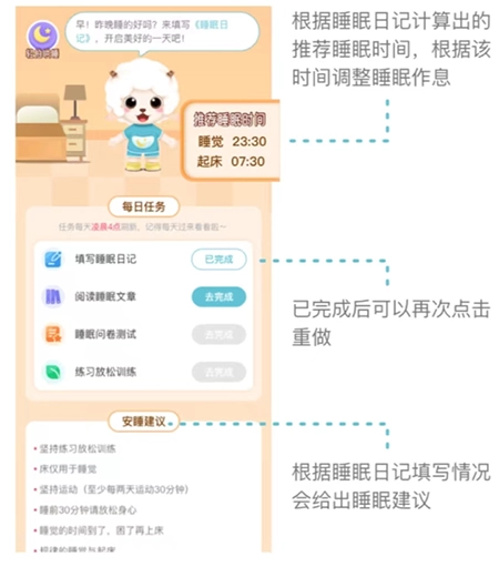 2、完成页面气泡提示的每日任务后,小梦会依据睡眠日记进行计算,逐步探寻出最契合您的睡眠时间。同时,小梦还会提醒您练习放松训练等事项,助力您重新塑造良好的睡眠习惯,进而提升睡眠能力。
