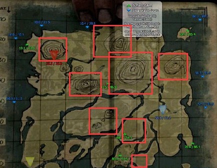 铁矿的大致分布图显示,富矿基本集中在五座大山上。地图中相对较小的方框代表几座山坡,只是规模比较小。这些地方大型食肉龙较少,海边则多是前期的食草龙,适合新手在此生存。