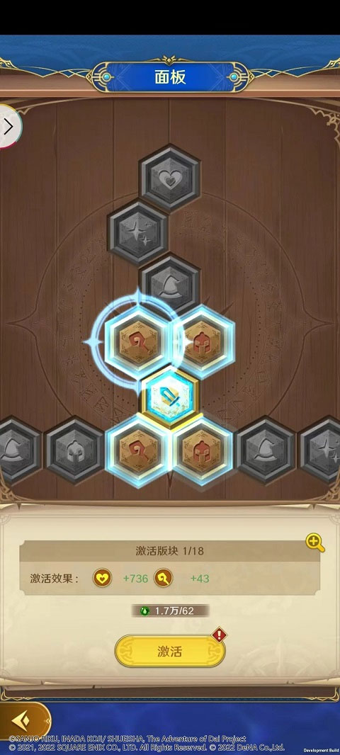 战力不够,Buff来凑。勇者们可以通过主界面左下角的悠久之间进入版图界面,激活面板上的板块就可以提升攻击力、防御力、血量等属性啦。