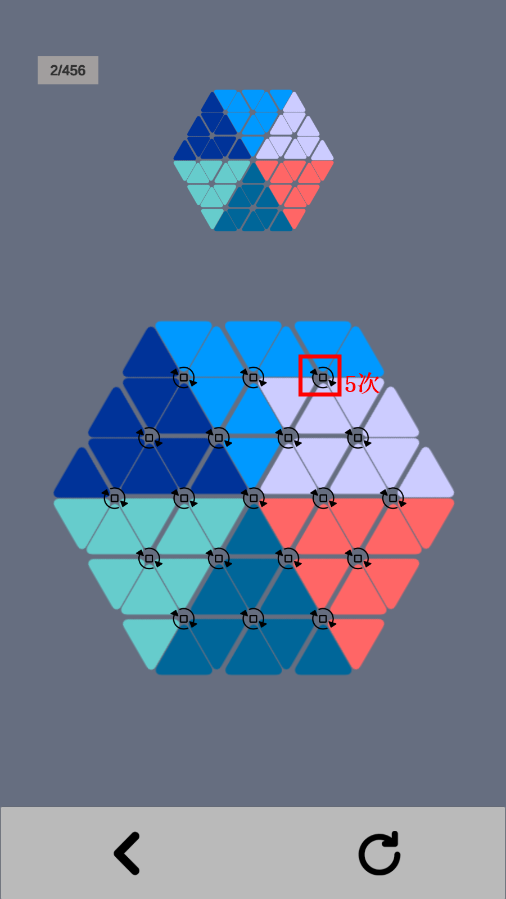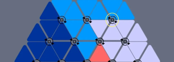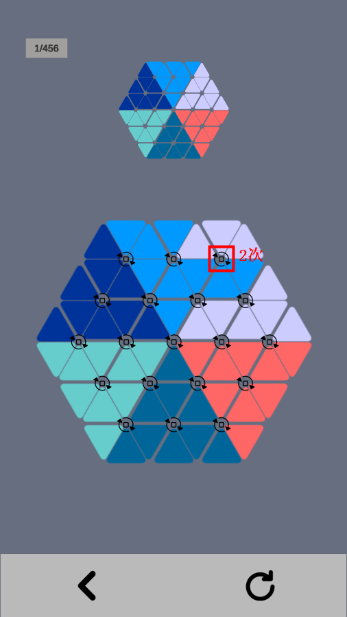 9、当后期关卡变得杂乱无章时,建议逐个按顺序还原三角形。不然,可能会出现未还原的大三角形夹在两个已还原大三角形中间的情况,这种状况下,若不破坏其中一个,便无法完成还原。