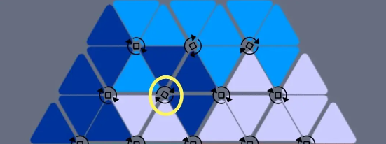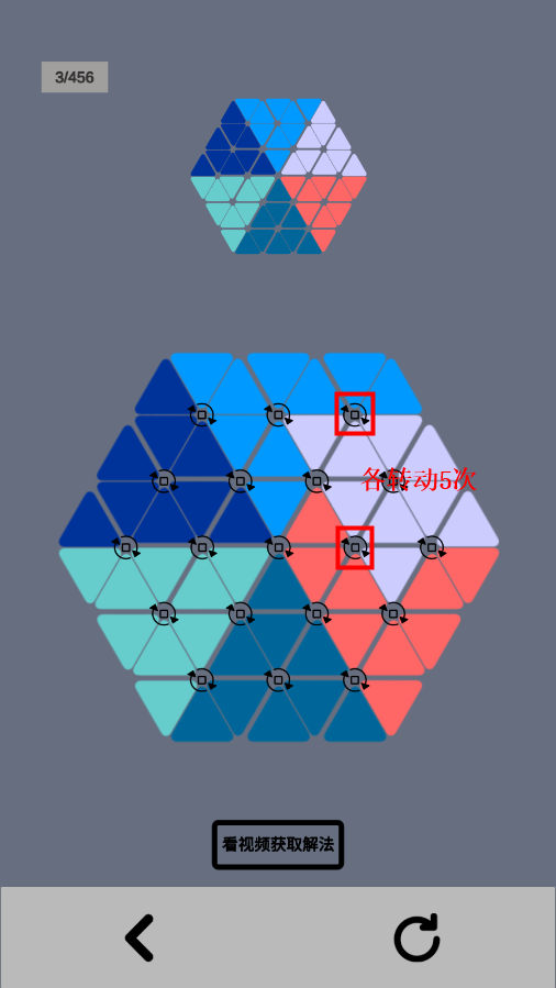 2、请注意,转动需按照箭头方向进行顺时针转动。每转动一次,周围的三角格子便会随之移动。