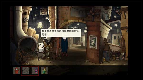 1、打开游戏,你会看到已经有的四个工具,将绳子和风向袋进行结合获得网兜,用来捕捉飞起来的小鸟。