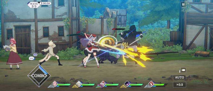 战斗系统十分简易,开启后将以半自动模式进行(新手教学结束后能直接切换为全自动且两倍速)。在与敌人自动交互攻击的过程中,玩家可使用画面左下方随机挑选出3人的Strike Combo技能,该技能会依据角色出场顺序附加数量递增的Buff,也可使用各角色的必杀技。此外,通关后能够开启扫荡机制,从而加快等级提升的速率。