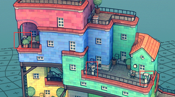 彩旗会在间隔1或者2个空间间隙的2层及以上建筑物之间生成,建筑物需满足上一层建筑基块与下一层的颜色不同。