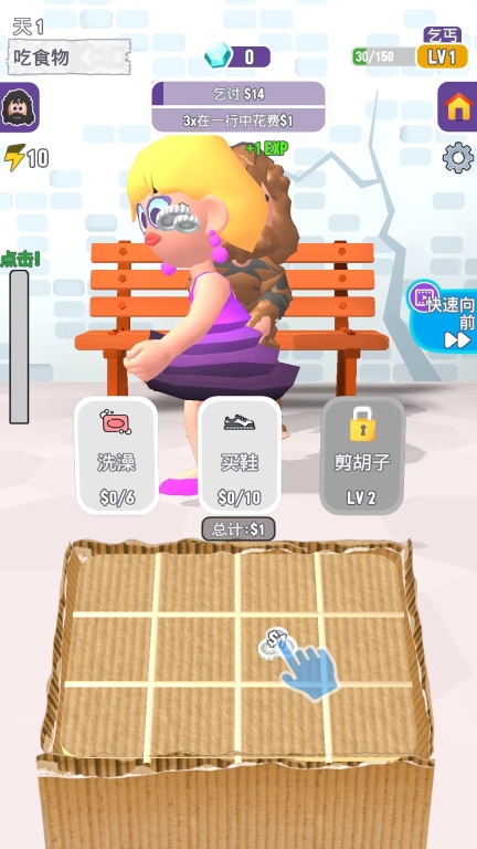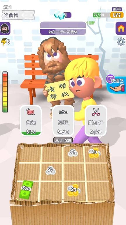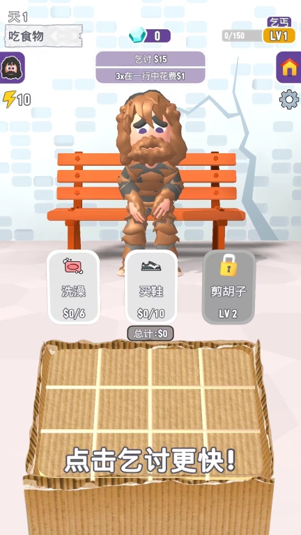 在《丐的逆袭》这款游戏里,玩家将化身为一名街头乞丐。在乞讨时,会收获过路行人给予的收入,只需点击屏幕,就能得到路人们的施舍。随着一笔笔小额金币不断累积,你可以把这些收入进行合成,从而换取更高金额。利用赚取的收益,去改善自身生活条件。从最基础的修剪头发、更换衣物开始,在持续乞讨的过程中,乞讨等级会逐步提升,赚到的收入也会随之增多,助力你实现买车买房的梦想,最终踏上富裕之路。