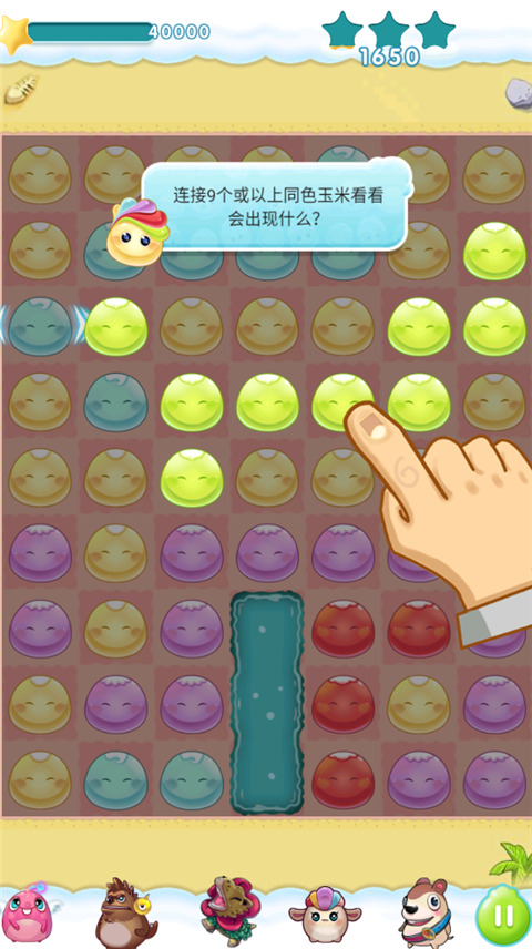 4、相邻且颜色相同的玉米,必须至少有三个,才能连接成一条线并爆破掉。