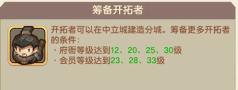 分城的建立需要开拓者来执行建造任务,开拓者可行军至周边不存在叛军且非无主的中立城处,着手建造分城。而开拓者的数量,能够通过提升府衙等级以及会员等级的方式来实现增加。