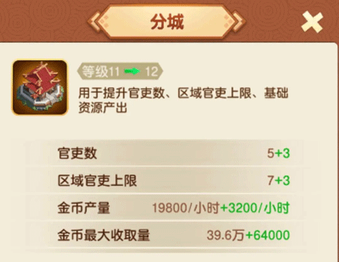 提升分城等级可以增加基础资源产出、官吏数、以及区域官吏的上限。