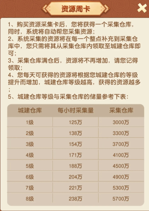 资源周卡:获得一个采集仓库,系统自动采集资源会在每个整点补充到仓库中。每天自动采集的资源会随着建造仓库等级提升而增加。