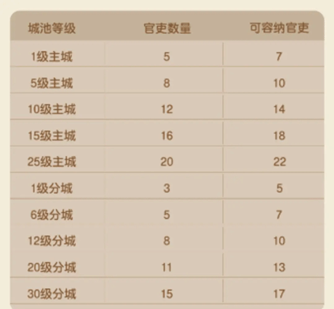 城池可容纳的官吏,随着城池的等级提高而提高。城池派遣的官吏越多、获得的资源越高。