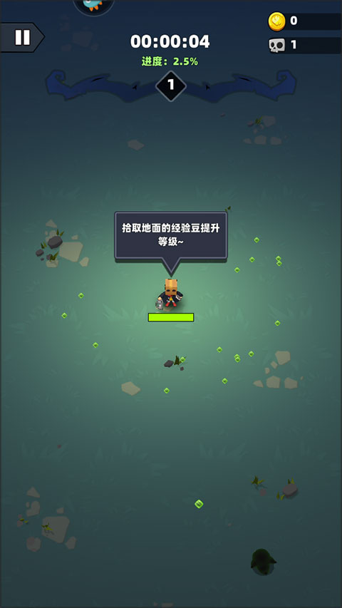 2、进入游戏后,通过在手机屏幕上进行上下左右滑动操作,来控制角色移动。当看到地下有经验豆时,拾取它们就能实现升级。