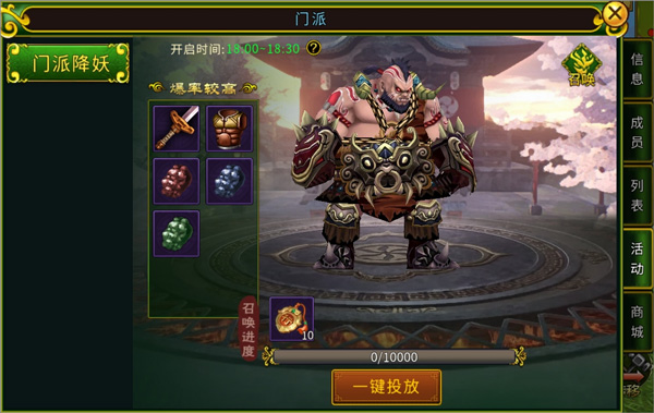 在门派里,我们可以体验有趣的活动玩法-门派降妖,和门派成员一起召唤妖兽,共同击杀获取奖励,也可以在使用“门派贡献”在门派商店里购买物美价廉的道具,还可以组织团建活动等。