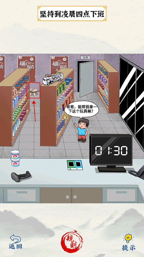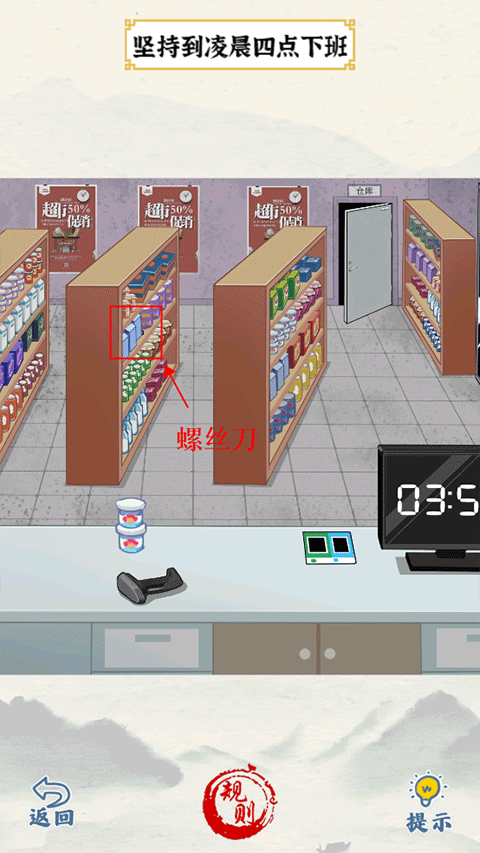 7、电话铃声响起时,先点击电话,接着在货架上拖动商品,找到螺丝刀。然后将螺丝刀拖动到显示器上,使时间变为四点,最后点击门即可通关。