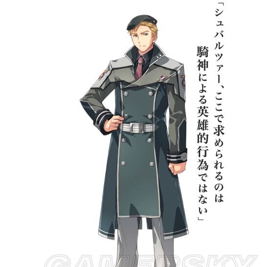 人物介绍:所属铁道宪兵队的精英特务少佐,性格严肃认真。内战中在帝国西部支援着处于劣势的正规军,同时和奥利维特皇子共同战斗,和克蕾雅是同期,对她有着明显的竞争意识,却又关心着她的动向。后来他被调任去分校担任主任教官,其真正目的是监视需要警戒的人物奧蕾莉亚,利用分校作为对抗猎兵团和暗中活跃的结社的手段。