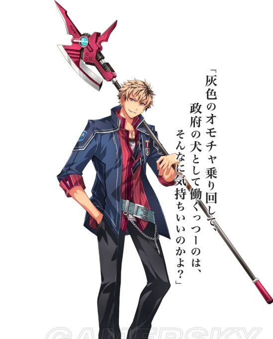 人物简介:此人为托尔兹士官学院特科班7班的在校青年,亦是灰之骑神瓦里玛的启动者。一年半前,埃雷波尼亚帝国内战结束后,克洛斯贝尔自治州被合并。随后,在北方战役中,他又为诺桑普利亚自治州的合并立下汗马功劳。因其功绩,在国内被民众尊称为“灰色的骑士”,成为了英雄。从士官学院毕业后,政府与帝国军向他抛出橄榄枝,但他态度坚决地予以拒绝。为了传承托尔兹的精神,同时避免自己与骑神·瓦里玛再度被他人利用,他来到位于帝都西郊的问题学校“第二分校”担任教官。