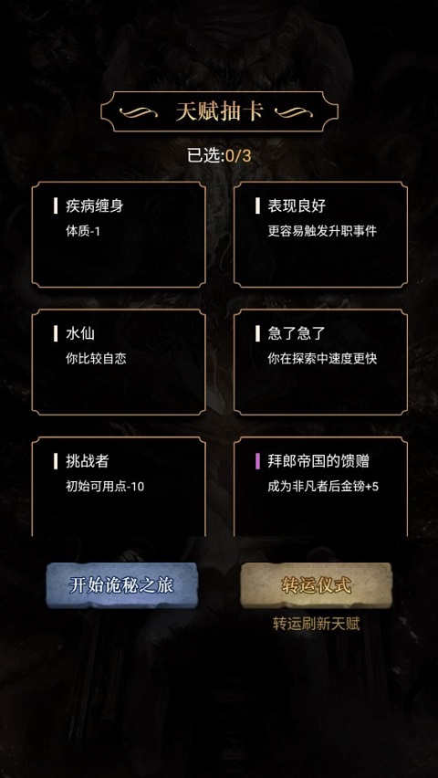 1、于经典模式中,开局天赋抽卡可自由挑选,属性点的分配同样延续《人生重开模拟器》的经典设定,共计20点,可供分配的属性包括体质、灵性、金镑以及运气。