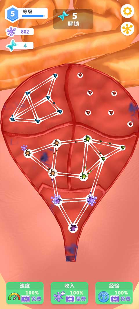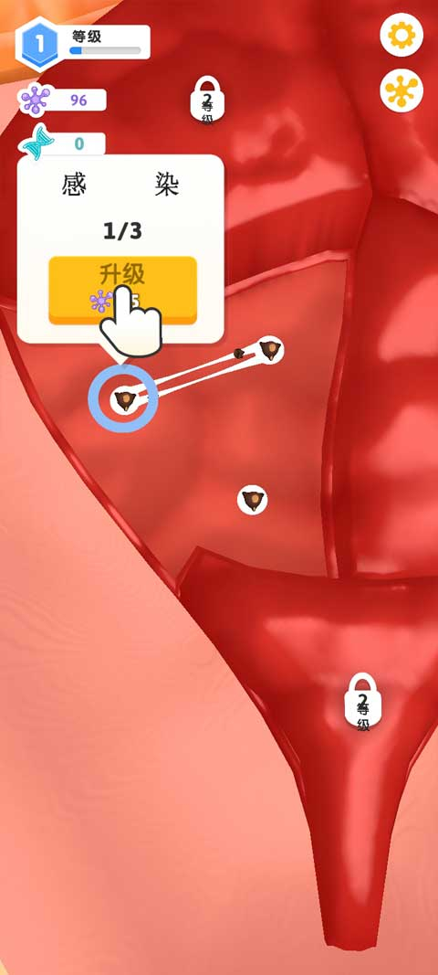 4、发展到后期,你会察觉到膀胱周边出现黑色物质,这便是病毒。此时,你得对细胞的连接方式加以调整,如此方能成功抵御病毒的侵袭。