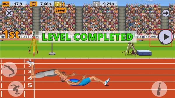 2、依据游戏里的障碍物或运动时机,有节奏地按下按键,同时在物理引擎设定的条件下把控好方向。在游戏过程中,主要对运动员的两条腿进行操控,每条腿对应一个按钮。