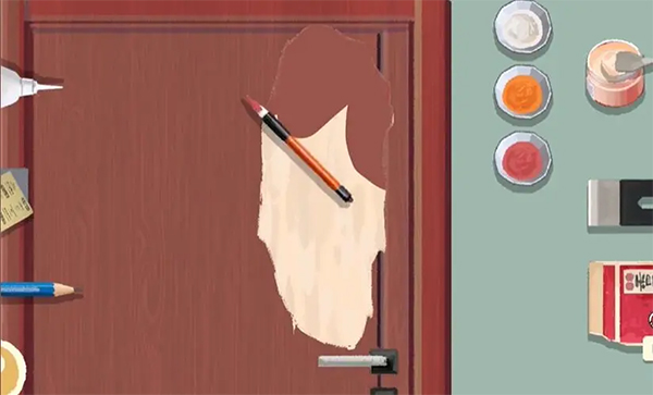 最后,我们使用磨砂布将胶水上的毛刺打磨掉,接着拿画笔涂抹上与门的颜色相近的橙色颜料,以此进行伪装。