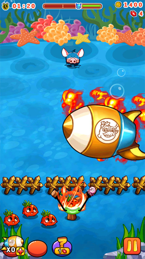 5、拉动弹弓瞄准怪物即可发射蔬菜;