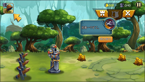 2、第一步要做的是招募矿工,他们可以协助你获取游戏金币,进而让你打造出更多更强大的士兵。