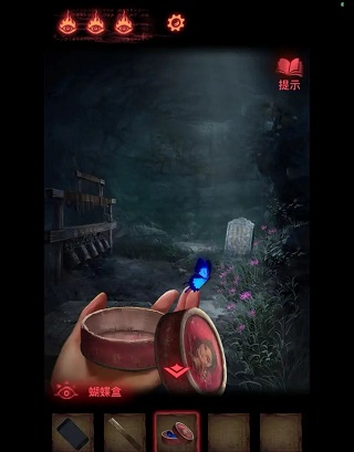 17、返回到大门位置,拿出【胭脂盒】点击蓝***,从而获取【蝴蝶盒】。随后带着【蝴蝶盒】回到花园,把蝴蝶放飞,蝴蝶会停歇在花朵之上,这时利用物品栏里的【锋利铜尺】将其取下,就能得到【冥陀兰】。