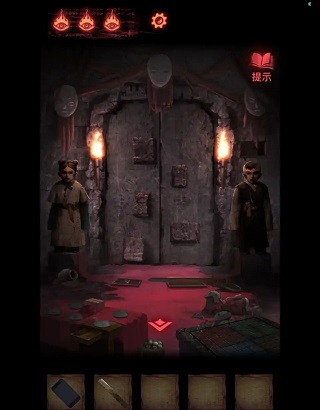 2、首先点击下方箭头,接着点击右侧箭头,即可来到本章节的第三个场景——忌物阁。点击中间墙面,完成转方格小游戏后,会获得墙面线索(8王4鬼5口1木8虫)。之后回到大门处,点击左侧磁盘,依照前面线索中的个数,依次在盘中放入糖瓜(8王4鬼5口1木8虫),随后打开抽屉,就能获得【蜡烛】和【石板】。
