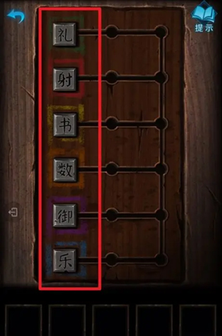 7、点击桌子旁的箱子,依据刚才获取的线索,自上而下依照“礼射数书御乐”的顺序挪动文字,完成游戏后,打开箱子即可得到【钥匙】