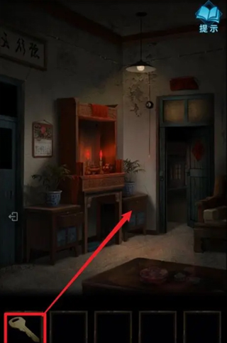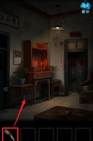 8、返回客厅,点击神龛右边的柜子,使用【钥匙】打开柜子,得到【老虎钳】