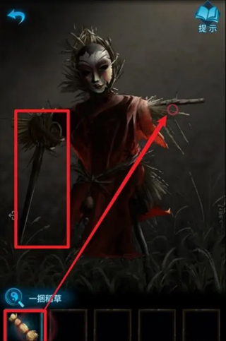 10、离开院子,点击田地里的稻草人获取【飘带】。需注意,要先经历一段剧情后,才能使用铡刀将【飘带】切断,从而得到【三段飘带】。接着,用【三段飘带】捆绑旁边的稻草,就能获得【一捆稻草】。最后,拿【一捆稻草】去修复稻草人,便可得到【火钳】。温馨提示,此处情节稍带惊悚,胆量够大的朋友请继续。