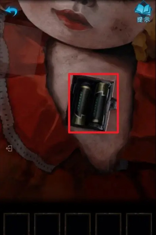 15、返回客厅,点击挂历下方的柜子,打开下方的柜门,用【铜指甲】拧开洋娃娃身上的螺丝,获取【电池】。
