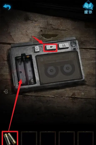 16、再次回到柴房,点击左边桌子上的录音机,把【电池】和【磁带】(点击录音机左边第一个按钮)安装好,接着按下播放键,从而获得线索:虔请魕娘子送子来。