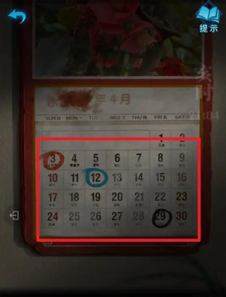 1、点击墙壁上的挂历,记住日记中标注的三个日期,红色03、蓝色12、黑色29。