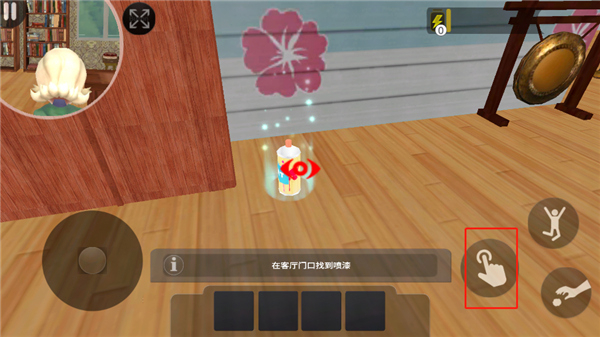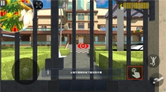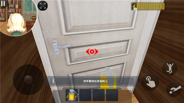 5、界面左上角展示的是菊子,玩家需时刻留意她的举动,避免被她抓住。当小圆点呈现红色时,玩家可点击手指按钮,开启铁门。另外还有两个按钮,功能分别是跳跃和投掷。