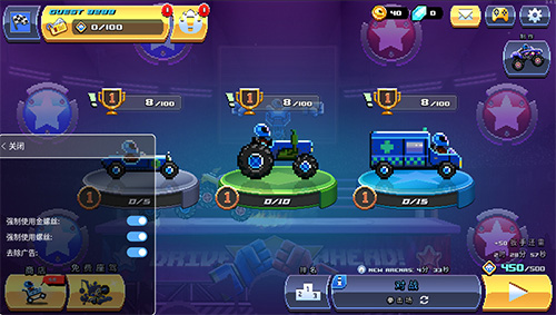 4、可自定义竞赛,也能选择随机模式,体验竞技场与决斗模式。你有本事打败怪物卡车和越野卡丁车吗?隐藏可没什么用!