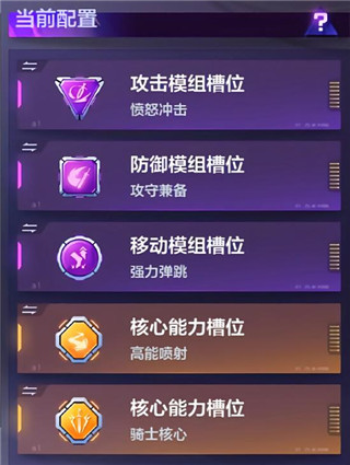 4、金色核心:高能喷射,选择高能喷射和骑士核心,这两套模组搭配,可以激活亚瑟三次突进能力,虽然每次突进的距离会相应减少,但是三次突进更能使敌人措手不及。骑士核心则可以使亚瑟的移速以及攻击速度大幅度提升