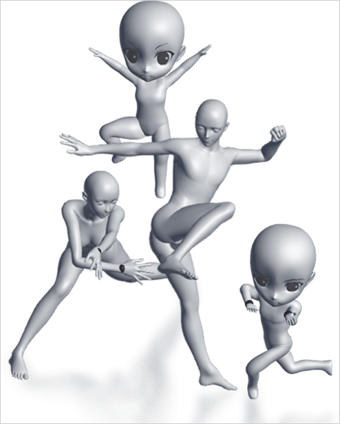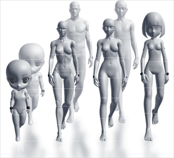 模型涵盖现实风格与动漫风格。头身比有1:3、1:5、1:6、1:7.5以及1:8 。同时还配备众多道具,像基本形状、家具、武器、配件、乐器等皆在其中。