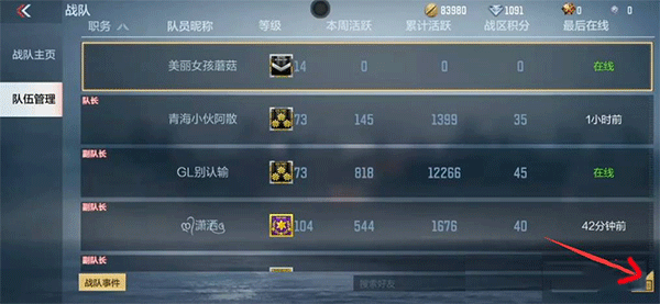 2、然后点击界面左侧的队伍管理,点击界面右下角的符号进入。