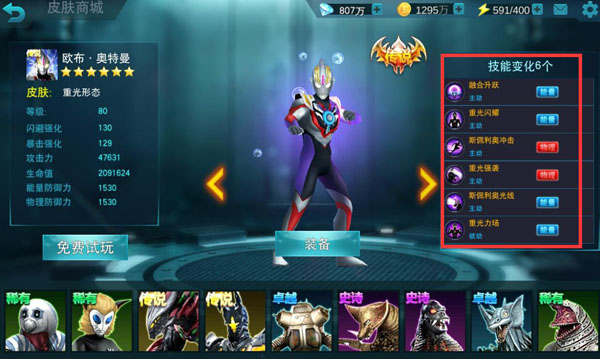 4、所有奥特曼怪兽任你选择,每个英雄更有专属皮肤!快来组建属于你的奥特战队吧。