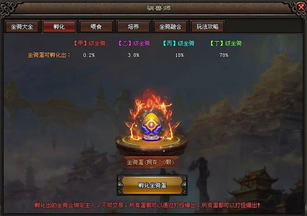 玩家进入游戏后,击败怪物可获得坐骑蛋,也可通过商场购买获得或首充礼包领取。前往龙城-驯兽师处将坐骑蛋孵化。