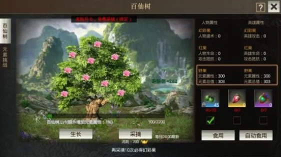 百仙果共有三种果子,分别是野果、红果、幻彩果,幻彩果效果更好,可以提升人物道术和英雄攻击,野果可以提供元素属性,虽说这个设定有些小氪的设定,但大体上影响不大哦~