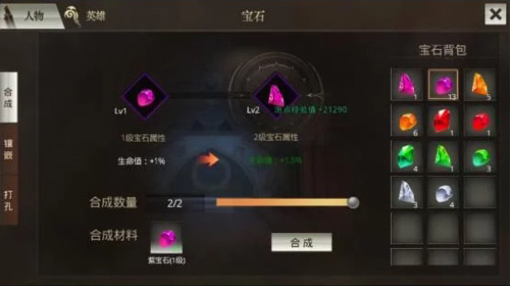 圣石类似于装备的挂坠,能够持续升级。不同部位的装备,所镶嵌圣石的属性各有差异,像武器镶嵌圣石可提升攻魔道百分比,衣服镶嵌圣石则能增加生命值。每件装备都能镶嵌3颗圣石,作用不容小觑。而且圣石合成也较为容易,只是到了后期合成LV.4圣石时,需要用到宝石合成符,而这种合成符只有通过打怪才能掉落。